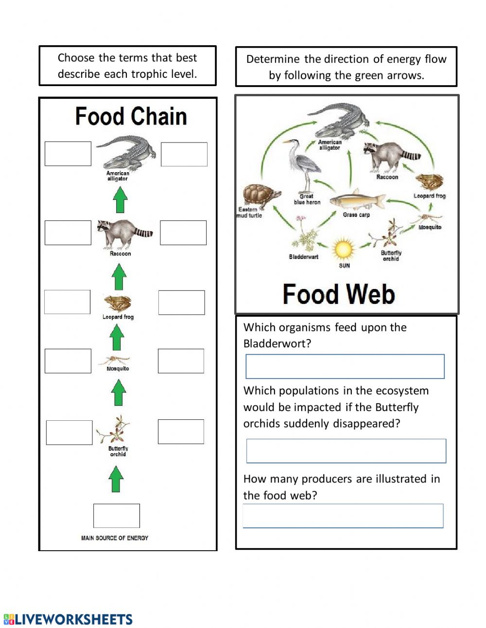 | 2.5 Food Webs and Ecological Pyramids شبكات الغذاء والهرم البيئي English Arabic Worksheets 2.5 Energy pyramid 2.5 Food web 2.5 Food chain |
